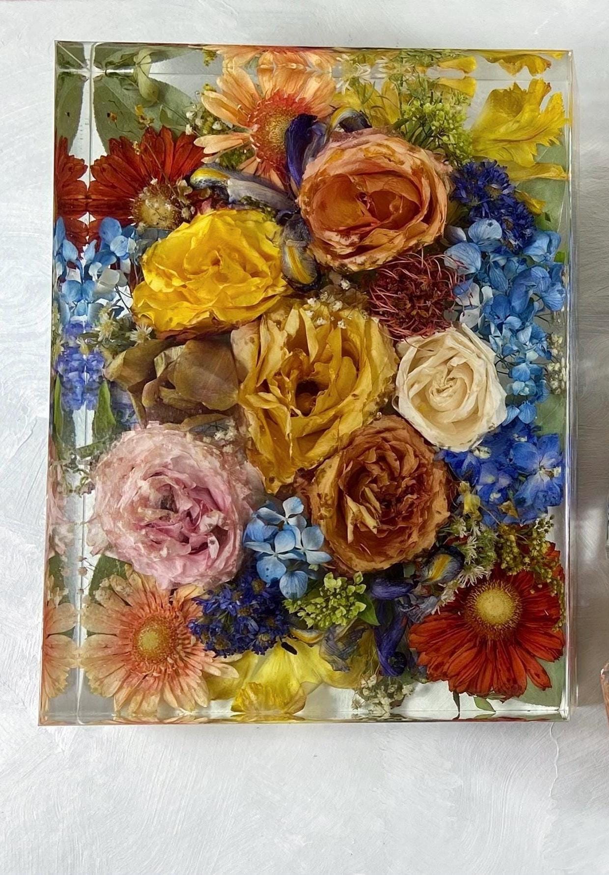 - Each piece is custom made with resin and as such can have some imperfections such as micro bubbles. Sometimes larger bubbles will also escape from air pockets in the flowers. They can also sometimes become trapped under petals along the sides or bottom of your keepsake causing an indentation. There is no way around the occurrence of bubbles but we do our best to minimize them.