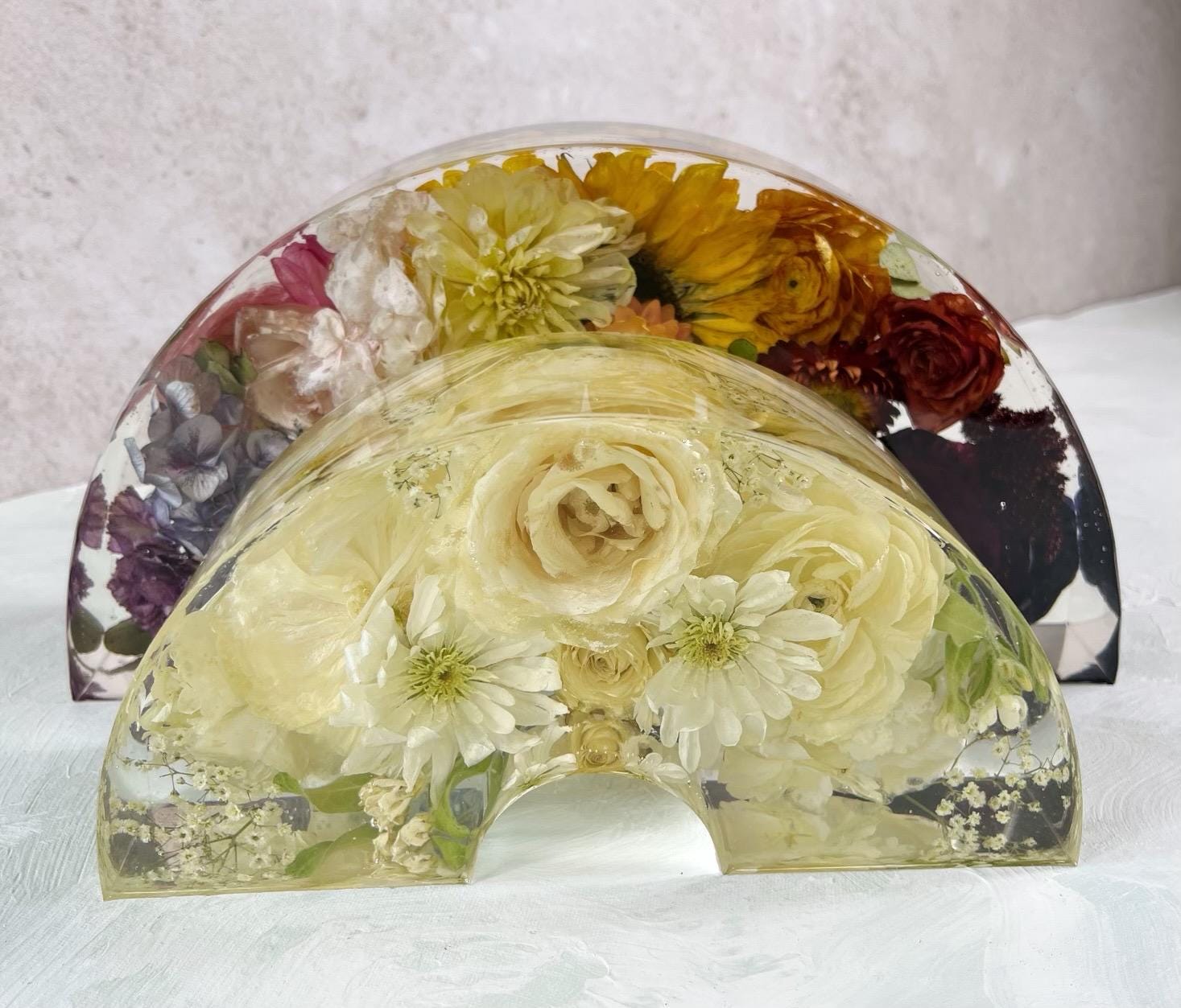 - Each piece is custom made with resin and as such can have some imperfections such as micro bubbles. Sometimes larger bubbles will also escape from air pockets in the flowers. They can also sometimes become trapped under petals along the sides or bottom of your keepsake causing an indentation. There is no way around the occurrence of bubbles but we do our best to minimize them.