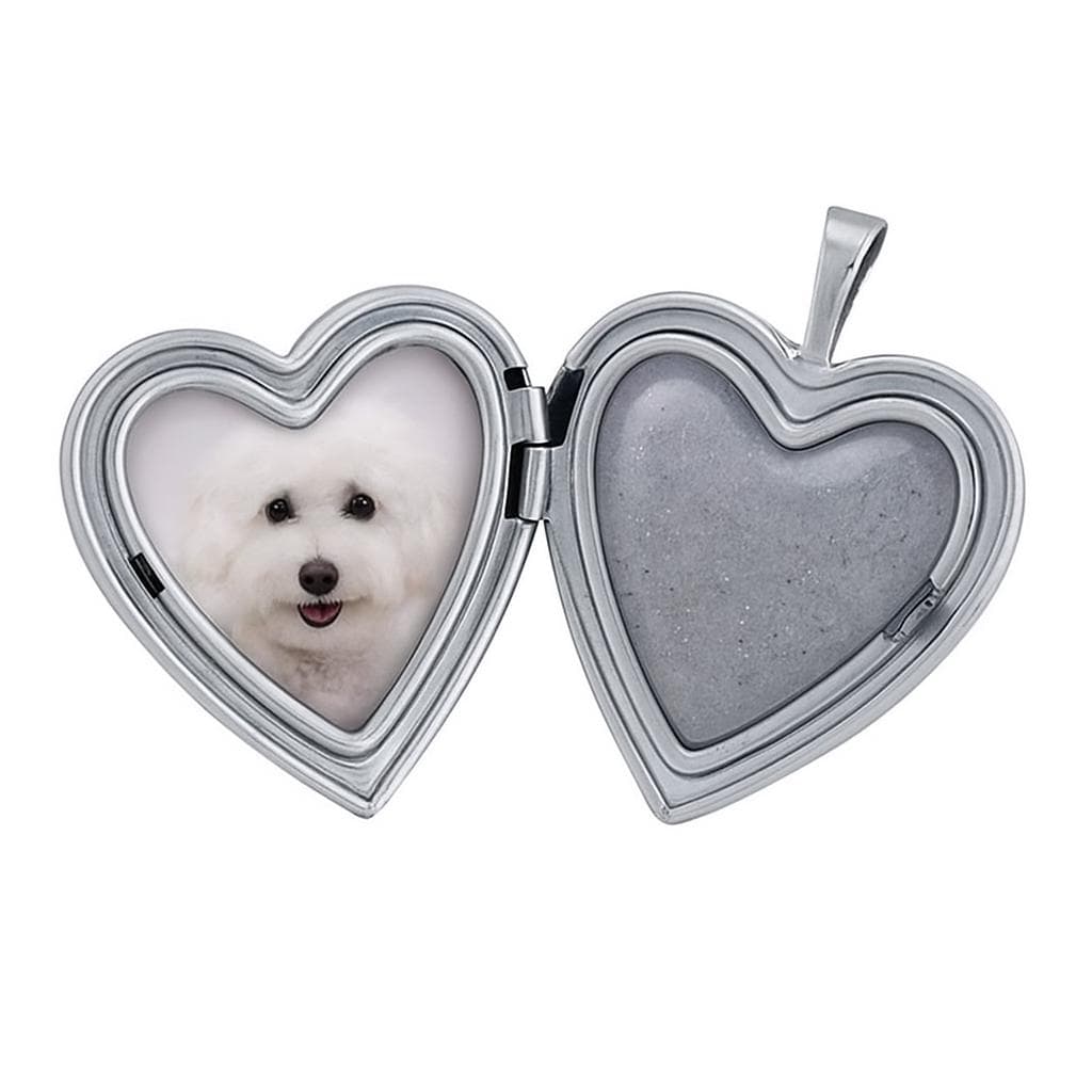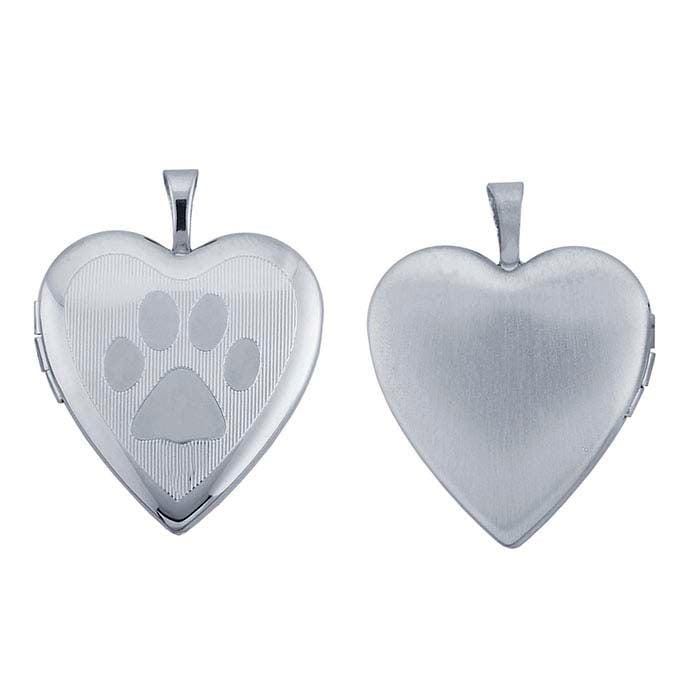 This sterling silver heart-shaped locket is slightly domed, giving it a substantial, puffed appearance. The front of the pendant has a bright finish with a lightly etched paw-print, while the smooth back has a matte finish. This locket holds two photos (the right side will include cremation ashes and resin), and includes protective plastic overlay. The interior bezel and snap closure mechanism are made of steel for strength and durability. A smooth tapered bail is fixed to the pendant—simply slide it onto a cord or chain to complete the piece.