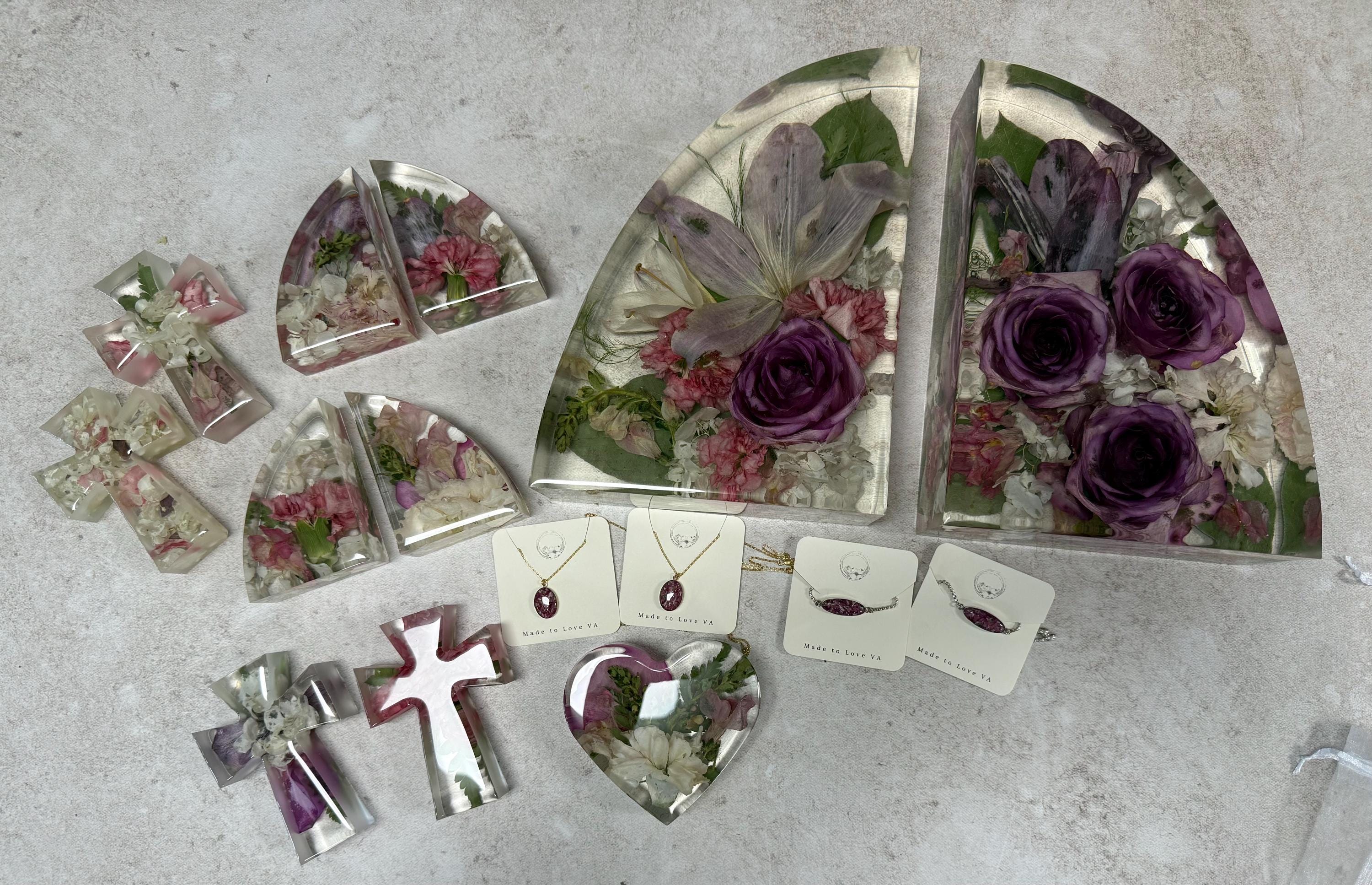 - Each piece is custom made with resin and as such can have some imperfections such as micro bubbles. Sometimes larger bubbles will also escape from air pockets in the flowers. They can also sometimes become trapped under petals along the sides or bottom of your keepsake causing an indentation. There is no way around the occurrence of bubbles but we do our best to minimize them.