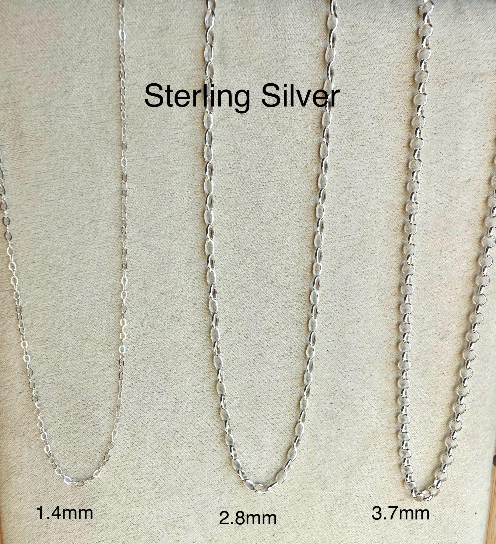Flat surfaces catch the light in this classic sterling silver oval cable chain, making the white metal even brighter. This is a great chain to pair with small pendants, charms and drops.