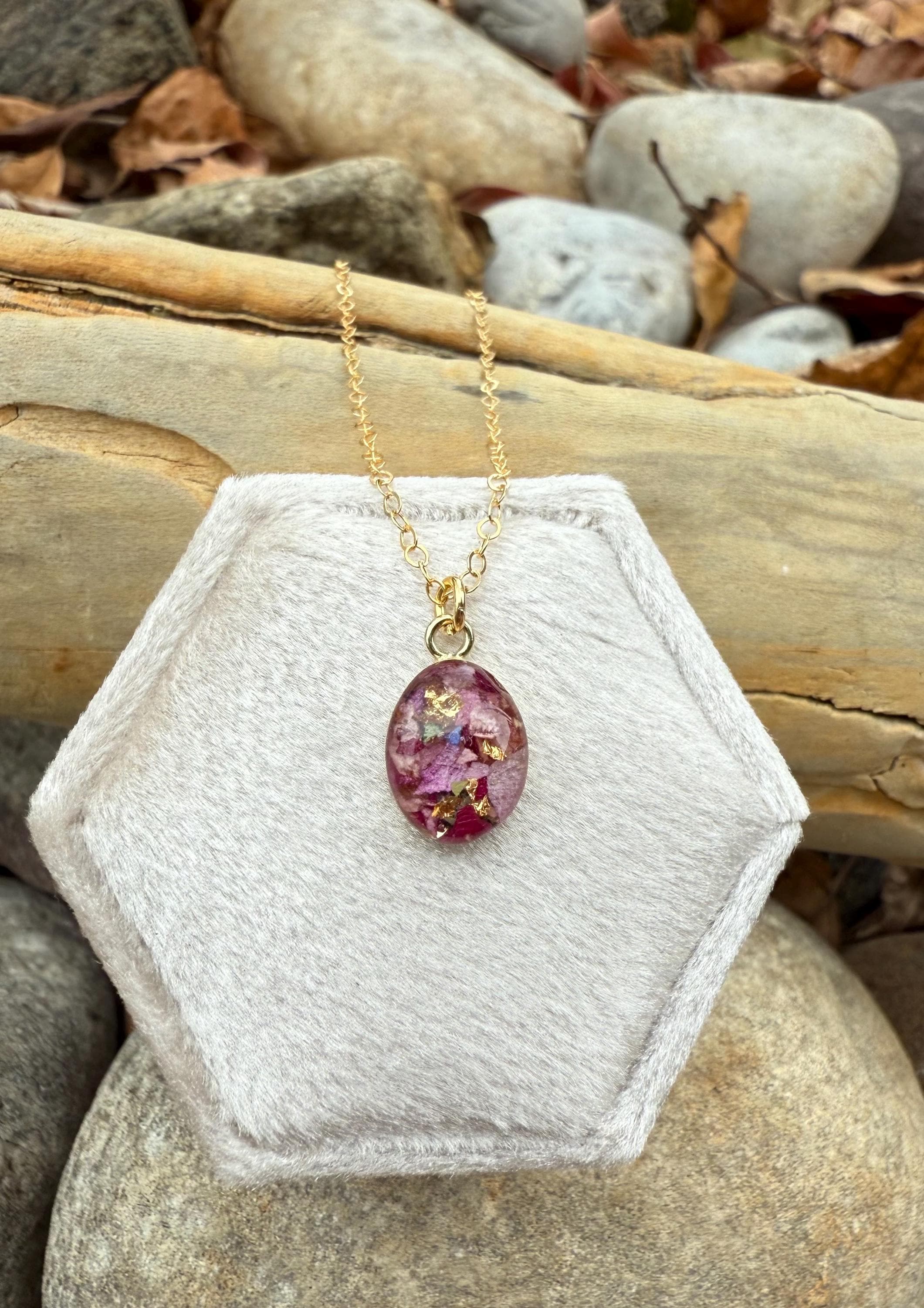 This oval 14k yellow gold filled handcrafted bridal pendant contains your flowers and resin. This pendant is a timeless keepsake and is a reminder of everlasting love and cherished moments. This is a pendant only (please specify size in notes). A small amount of gold flakes will be added unless you ask me to omit. The chain is sold separately.