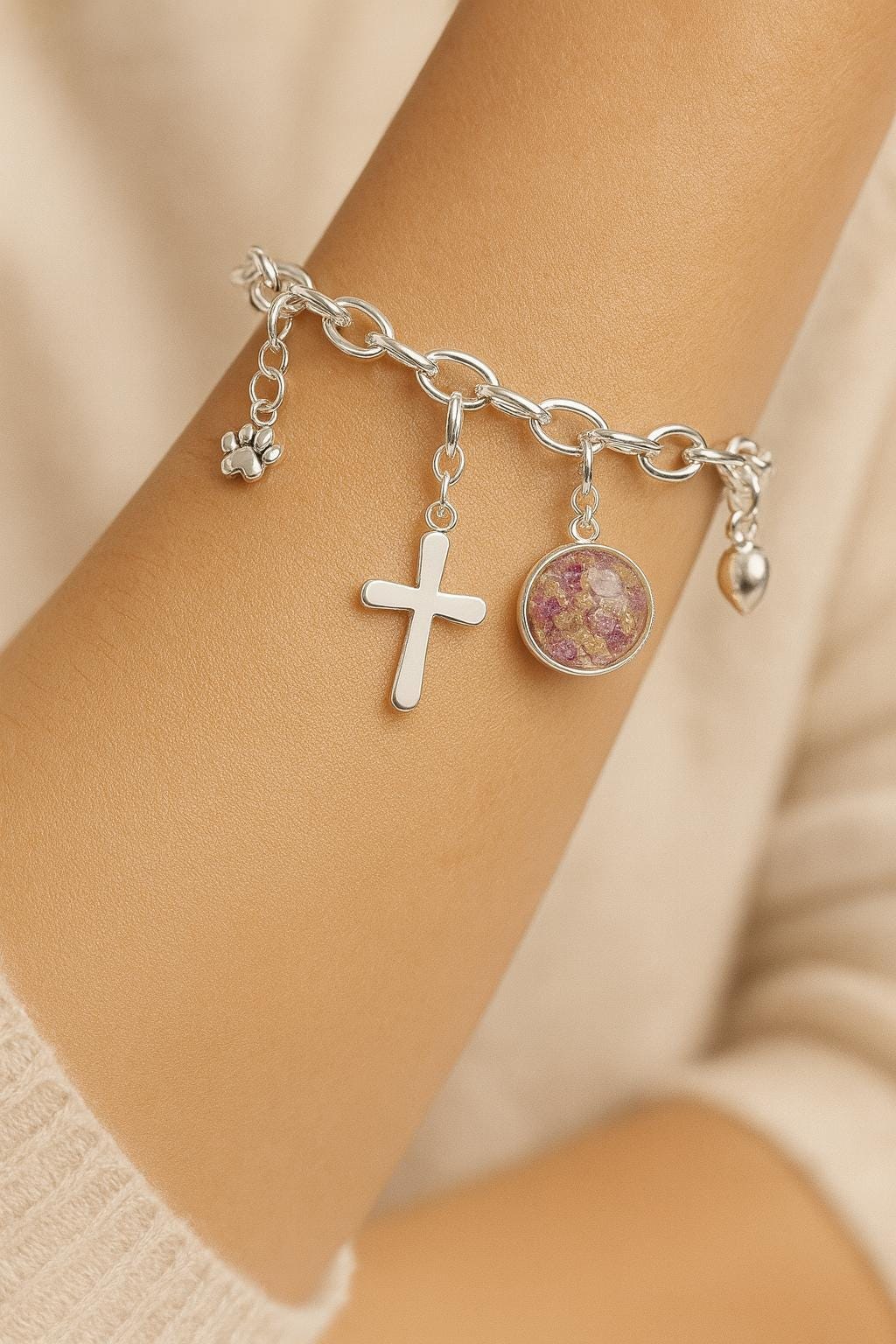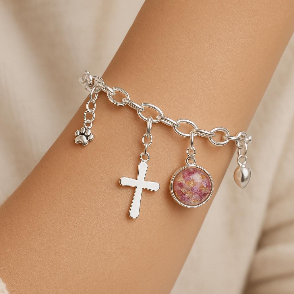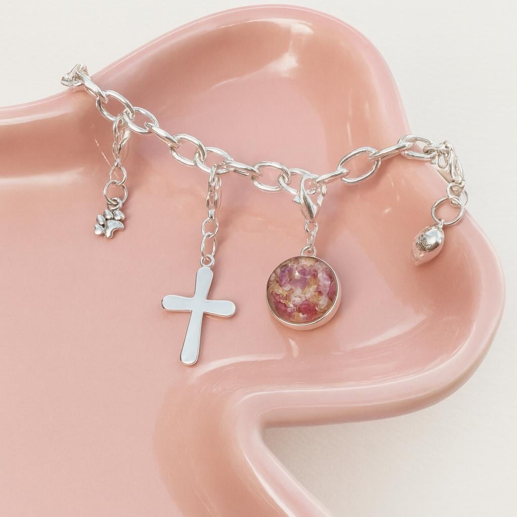 Combo Bracelet: Dried Flower Charm, Paw Print Charm and Cross Charm in a Sterling Silver Bracelet