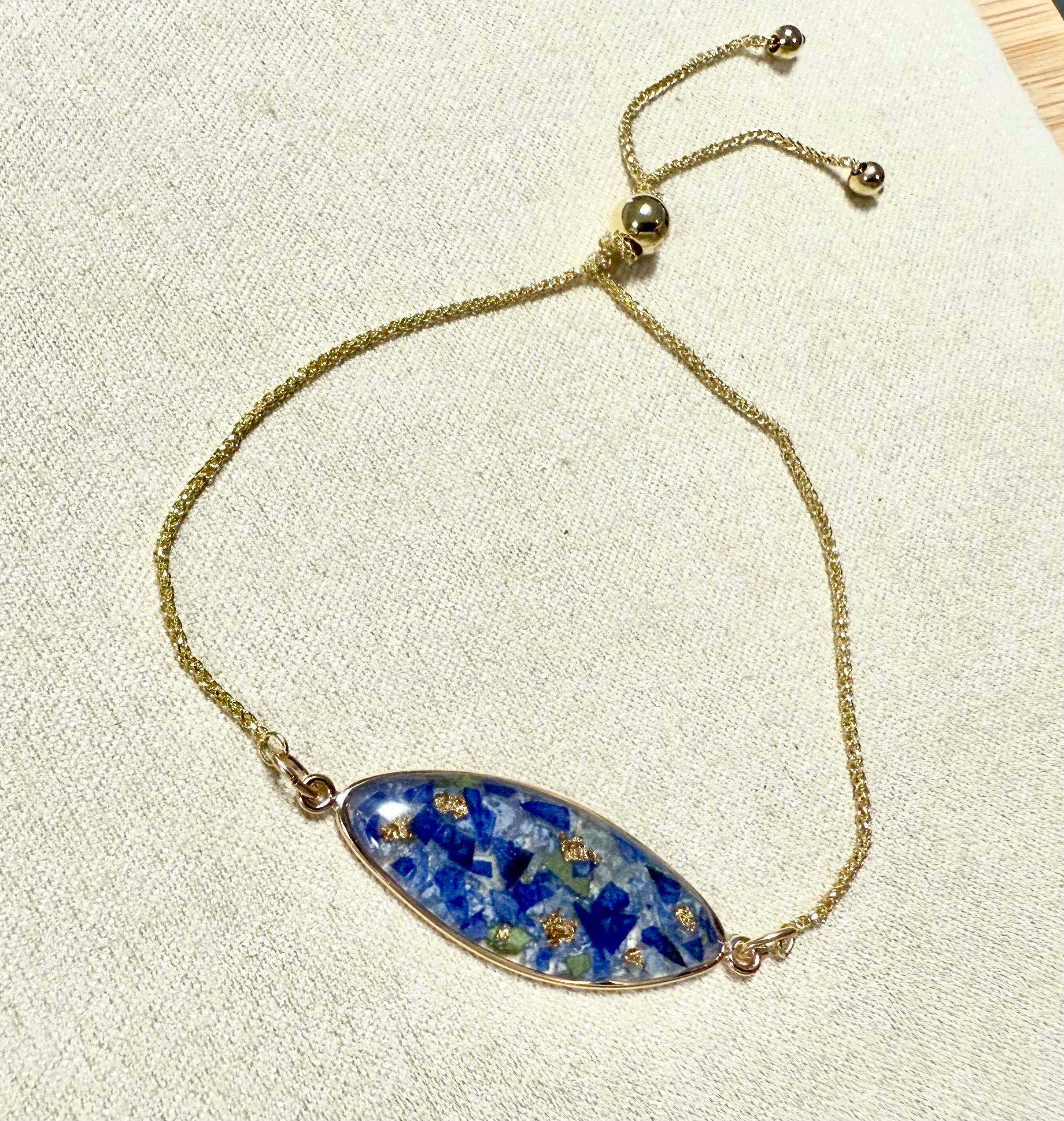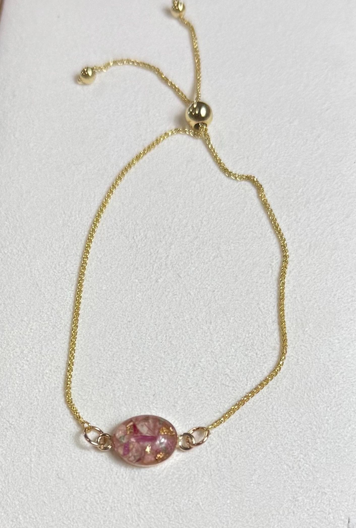 This 14k yellow gold handcrafted diamond-cut wheat chain bracelet is made with your flowers and resin. The bracelet is fully adjustable using a movable round silicone-lined bead (5mm) that slides along the chain. Two round drops (3mm) finish the chain and serve as a stop to keep the slider bead from slipping off the chain.