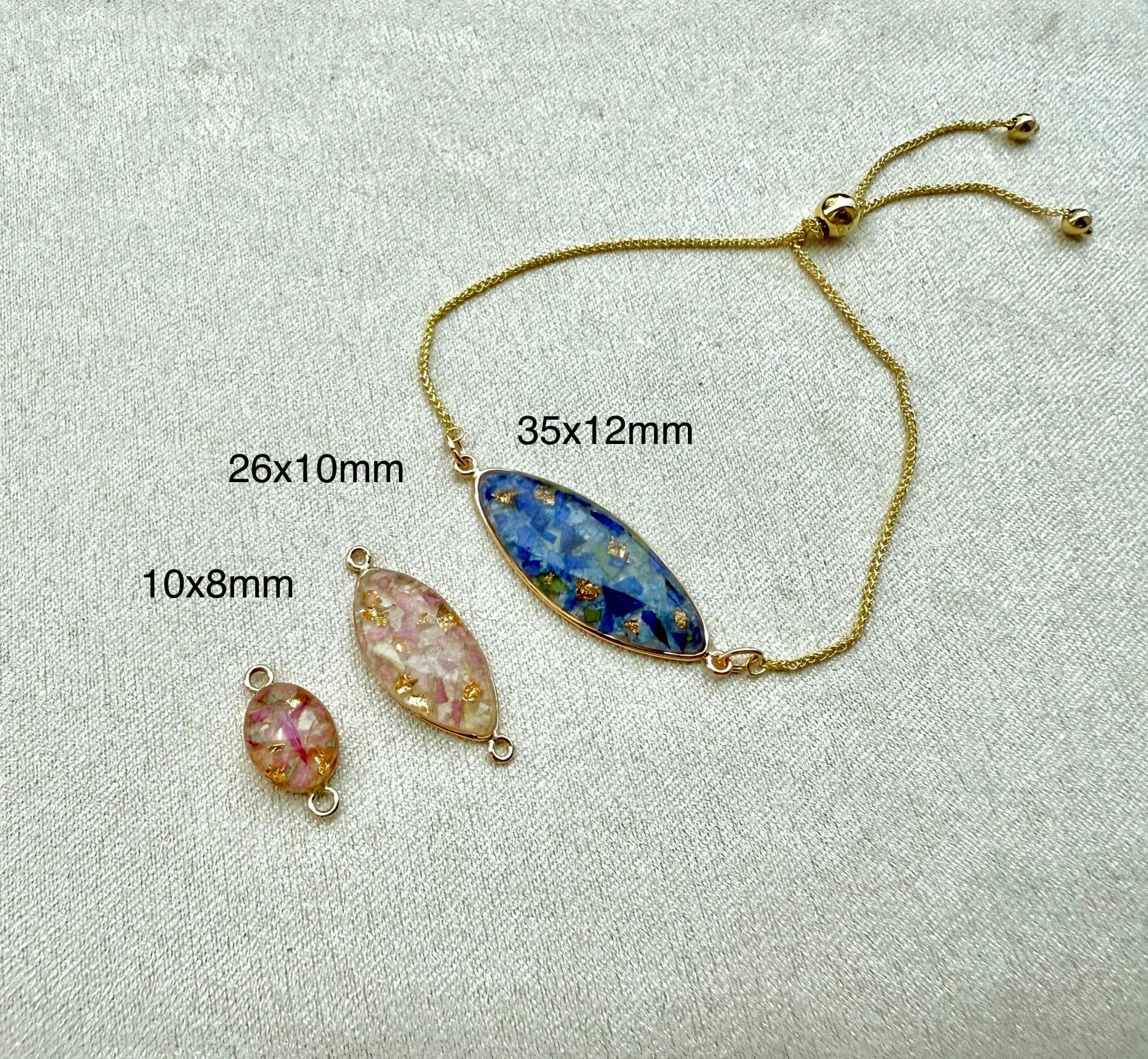 The flower will be placed in resin inside of the oval bezel. A small amount of gold flake will be added unless you ask me to omit. The bezel is 14/20k yellow gold-filled and comes in your choice of bezel sizes: 10x8mm, 26x10mm, 35x12mm(please specify the size you would like in the notes when ordering).