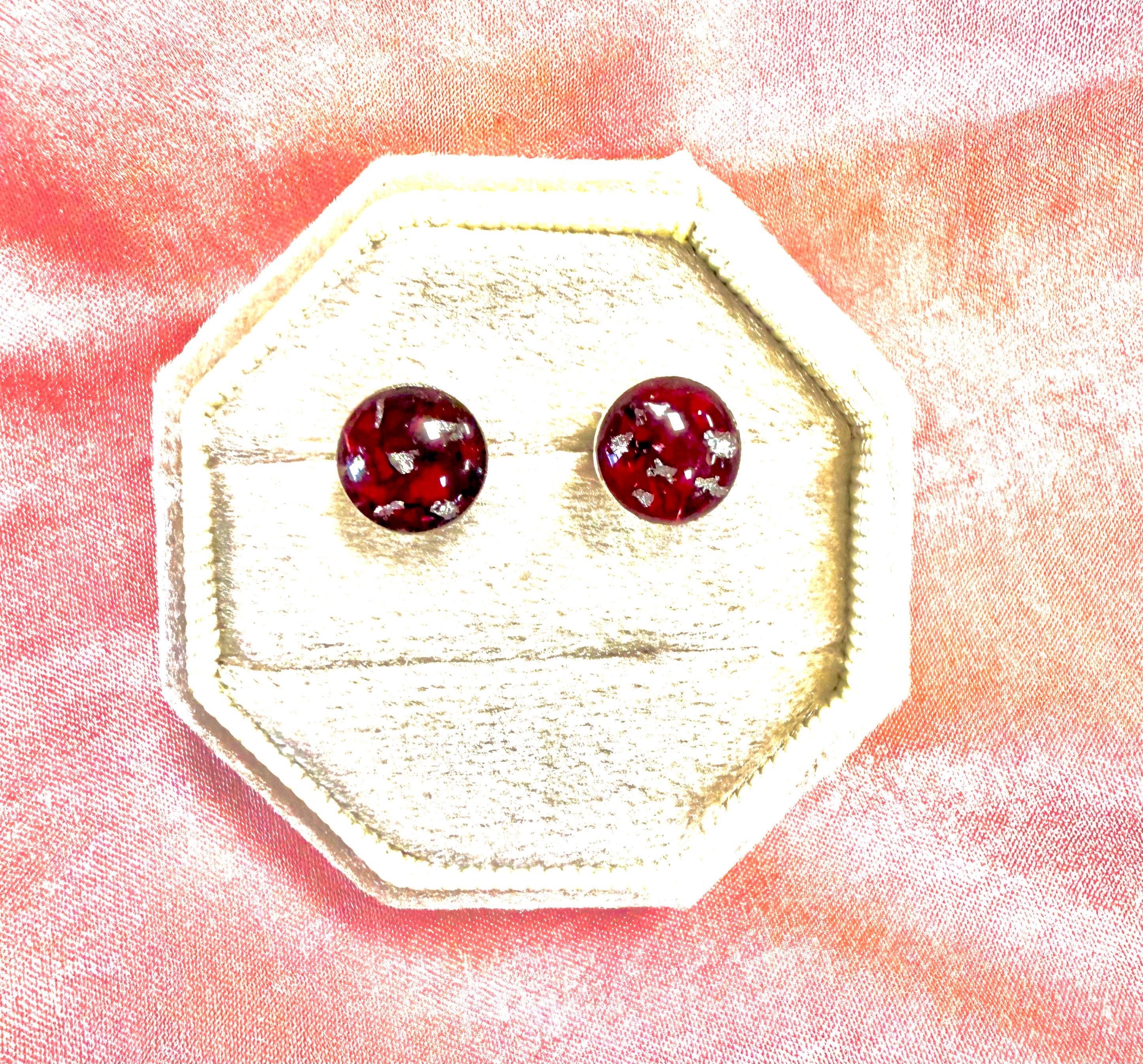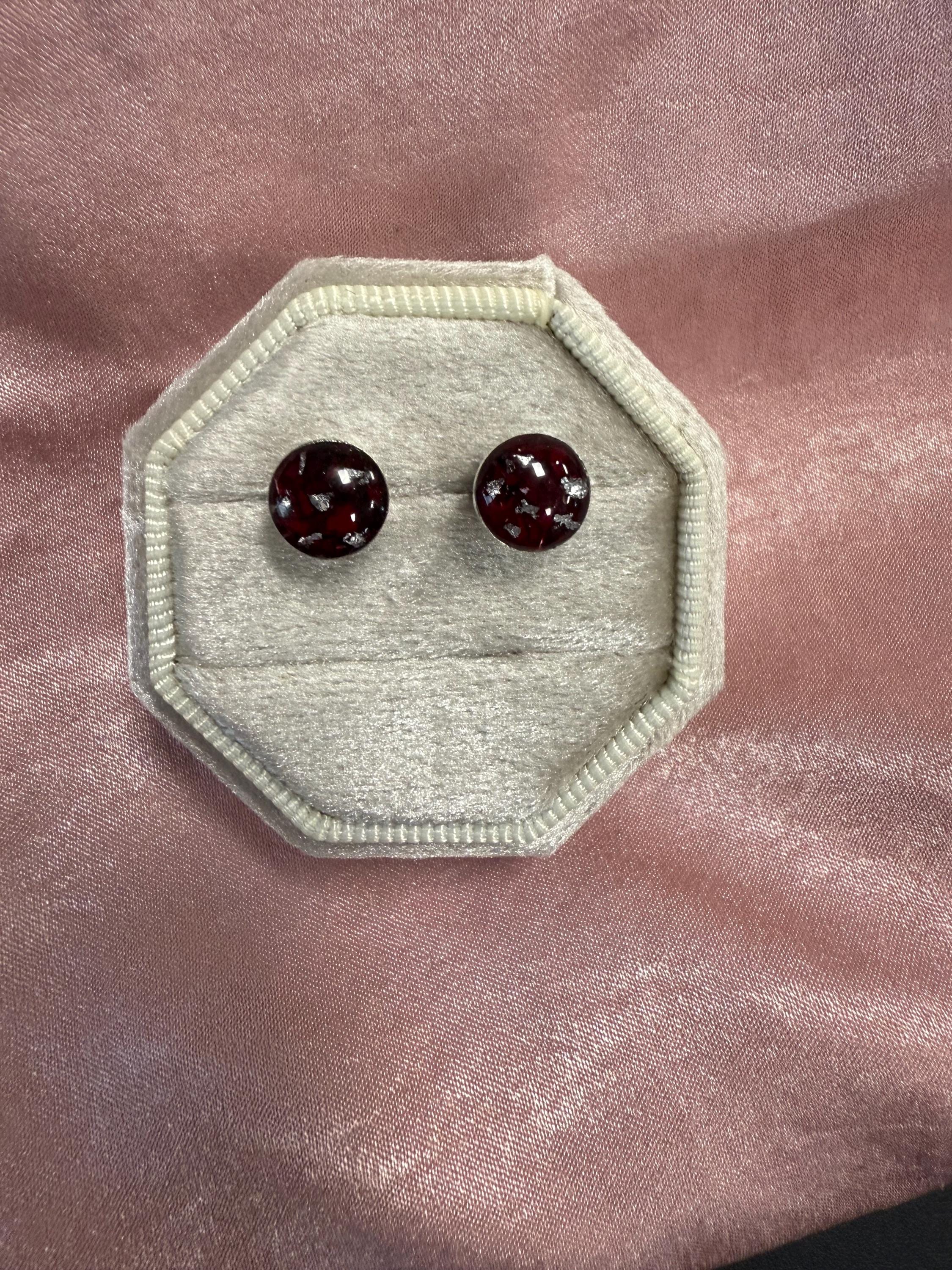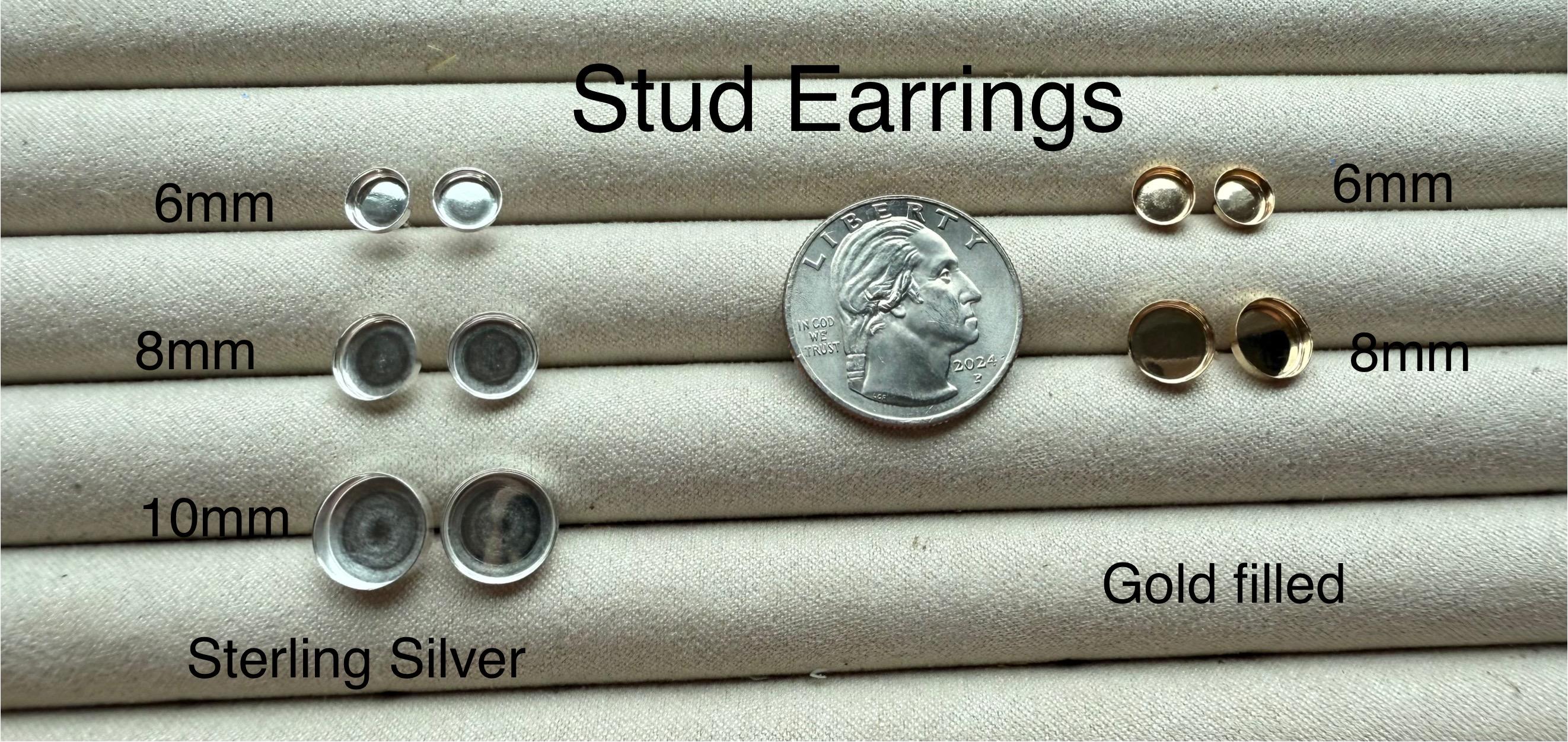 These .925 sterling silver post earrings feature a round bezel mounting 6mm, 8mm or 10mm in size. Small bits of silverflake will be added unless you ask me to omit.