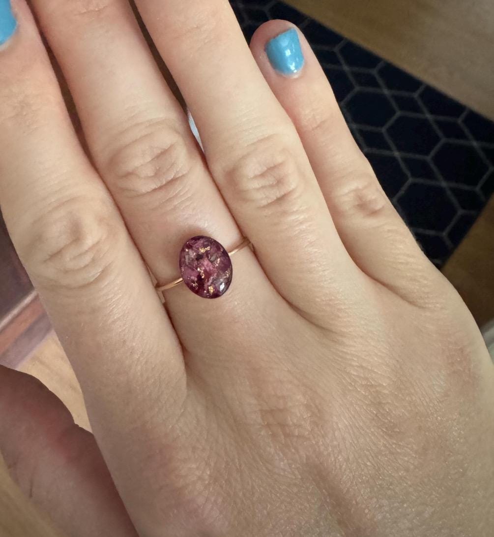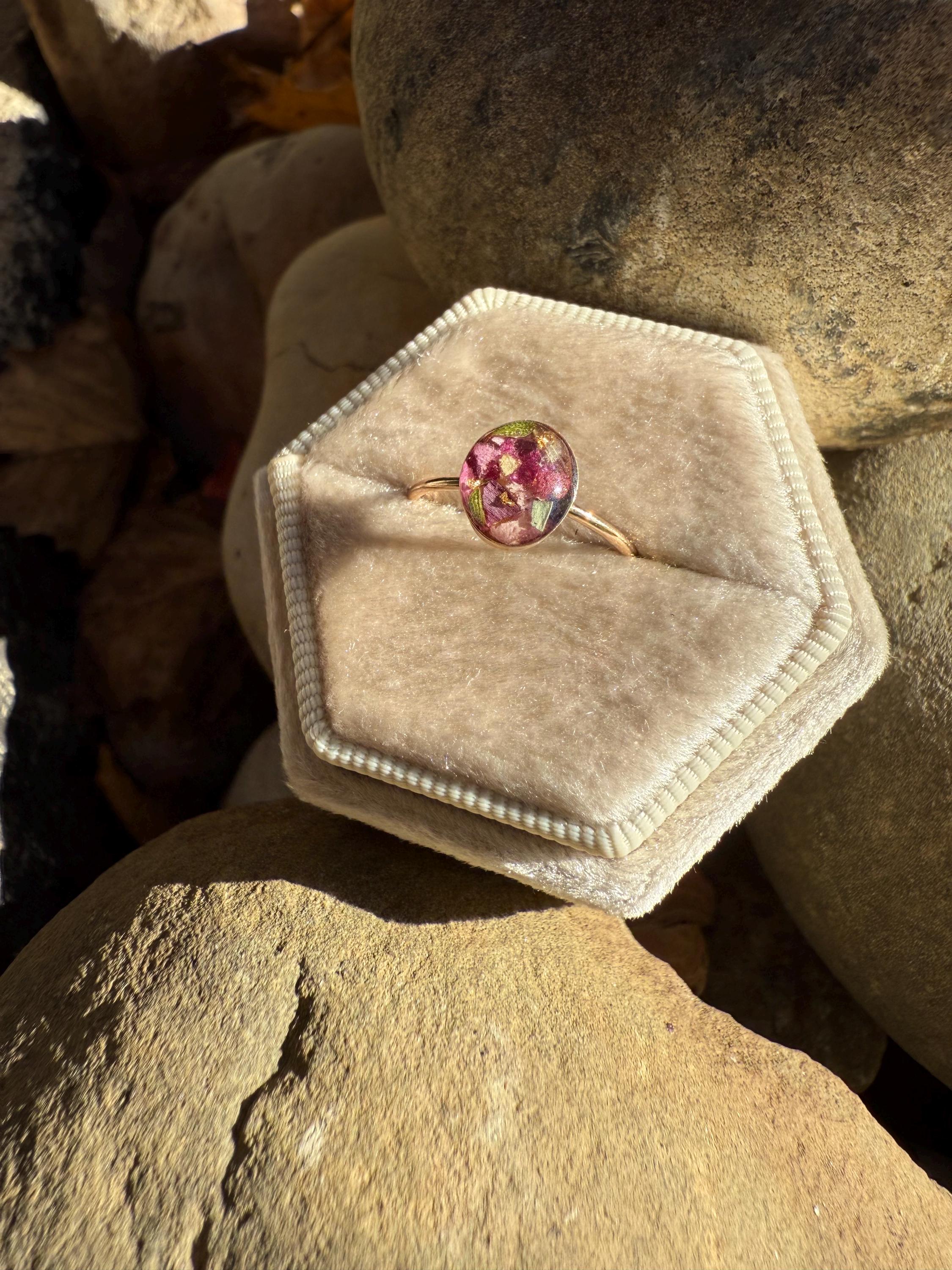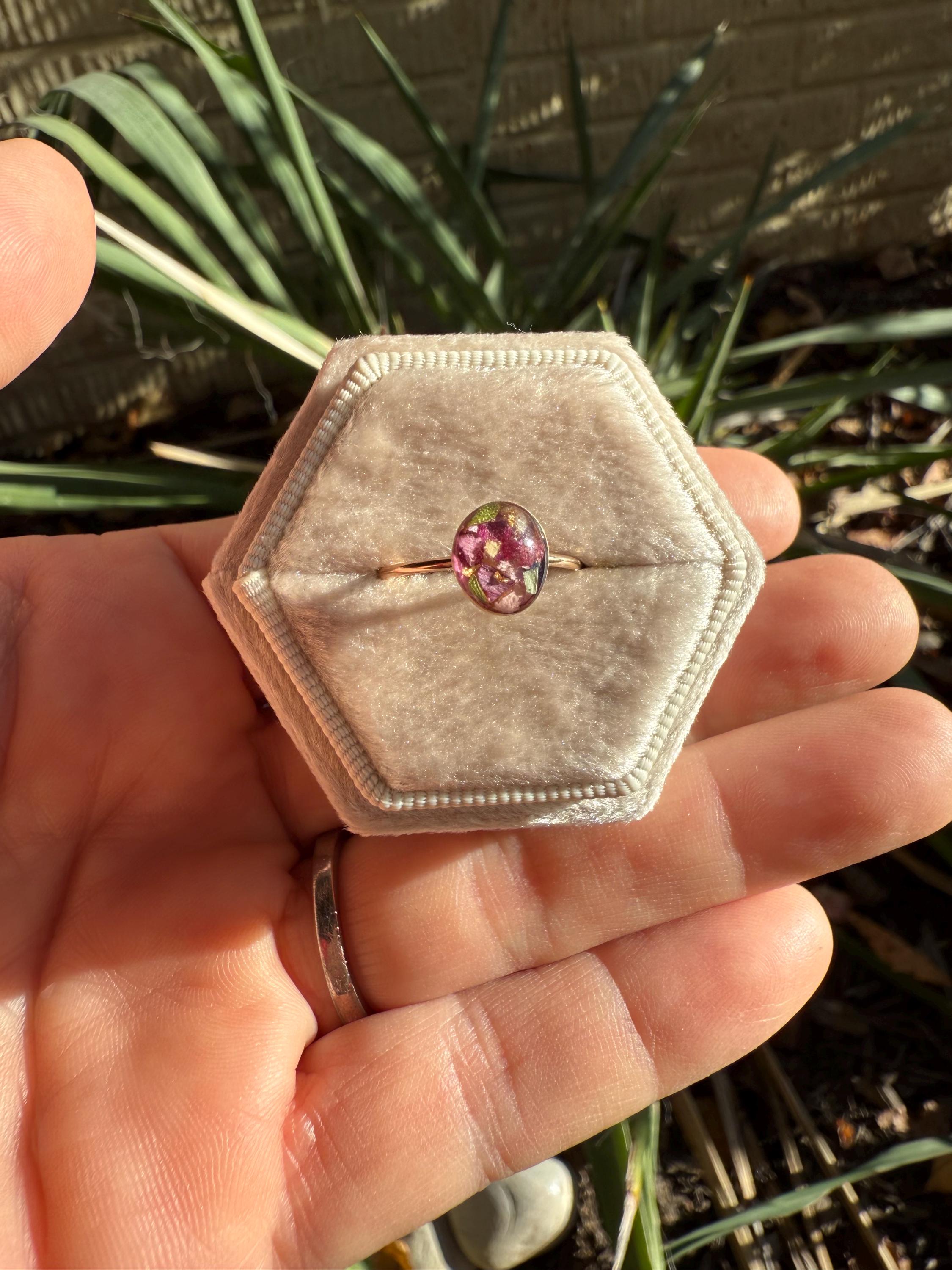 14k Gold-filled oval ring made with your bridal flowers. A small amount of gold flakes will be added unless you specify otherwise.